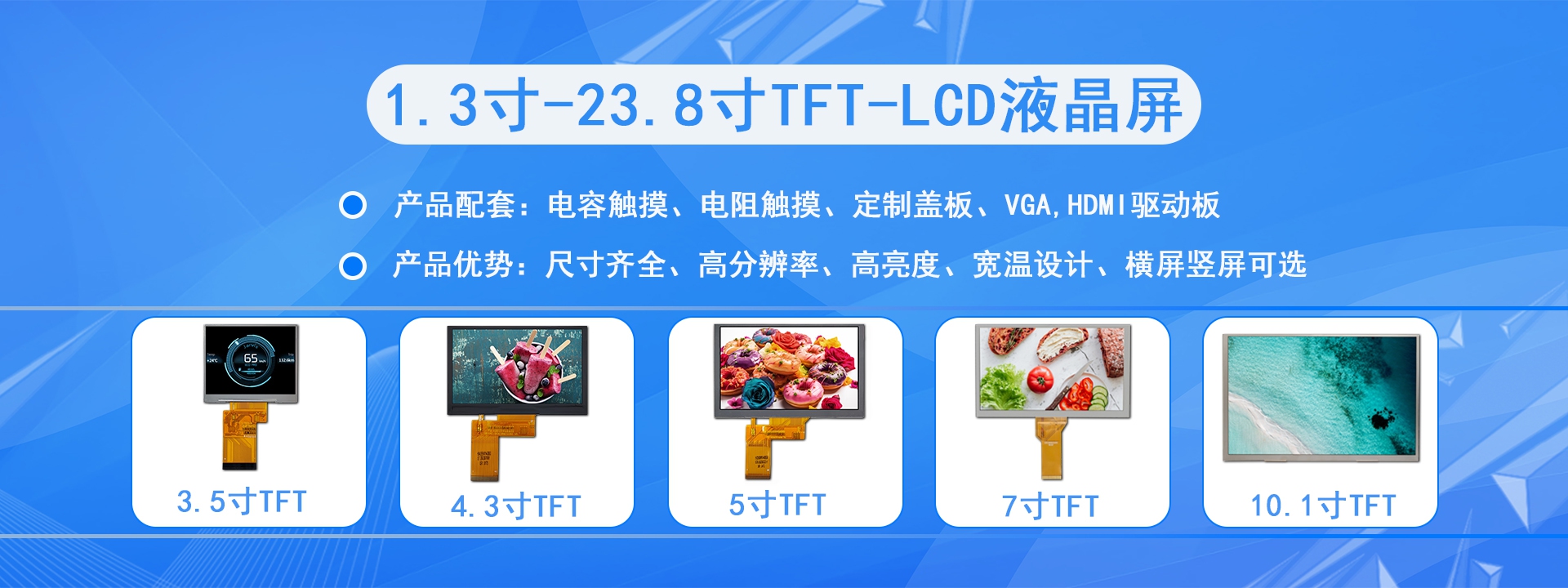 公司主營產品為0.96寸~27寸液晶屏及相關配套產品,主力尺寸為3.5”、4.3”、5”、7”、8”、9”、10.1”、11.6”、13.3”、15.6”。綜合月生產產量約500-800K。我們的產品超過60%為按客戶需求定制的產品,多年的行業經驗讓我們可以根據客戶的產品應用提供建設性的定制建議。